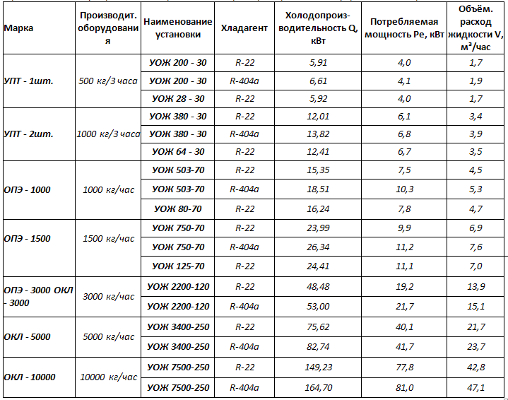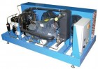 Установка охлаждения жидкости серии УОЖ Установки предназначены для охлаждения промежуточного хладоносителя в замкнутом цикле. В качестве промежуточного хладоносителя может использоваться вода. В этом случае минимально возможная температура на выходе из теплообменника составляет +3…+4ºС. Так же, в качестве промежуточного хладоносителя, может использоваться рассол (раствор пропиленгликоля или этиленгликоля, формиата калия и пр.) в этом случае минимально возможная температура на выходе из теплообменника может составлять -35…-40ºС. Чиллеры, для установок прессования и охлаждения творога УПТ и пастеризаторов ОПЭ и ОКЛ, на базе герметичных и полу-герметичных поршневых компрессоров производства фирмы "Maneurop" и "DORIN".