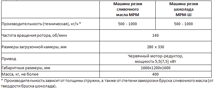 Машина резки сливочного масла, прессованного какао, шоколада серии МРМ Предназначена для измельчение в стружку монолитных брусков замороженного сливочного масла, замороженного творога, монолитных брусков прессованного какао (шоколада). Характеристики
