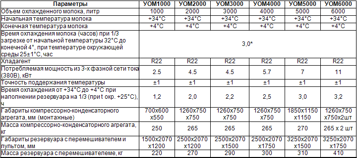 Установка для охлаждения молока открытого типа УОМ1000, УОМ2000, УОМ3000, УОМ4000, УОМ5000, УОМ6000 Основным отличием установок для охлаждения молока открытого типа является применение медного многосекционного трубчатого испарителя, припаянного к внешней стороне днища ванны, по которому циркулирует хладагент (фреон R22). Данная конструкция, кроме высокого КПД и, следовательно, более эффективного охлаждения, имеет значительный запас прочности по повышенному давлению и не боится промывки ванны горячей водой. Сама ванна имеет удобную для обслуживания прямоугольную форму и изготовлена из пищевой нержавеющей стали, термоизолирована снаружи, облицована листовой нержавеющей сталью, имеет электромеханический перемешиватель с напряжением питания 12В и съемные верхние крышки. Температура охлажденного молока постоянно индицируется на пульте управления с цифровой индикацией. При достижении заданной температуры установка для охлаждения молока автоматически переходит в режим поддержания ее. Установки для охлаждения молока УОМ4000-УОМ6000 комплектуются элементами механической мойки. Все установки для охлаждения молока комплектуются широко распространенными компрессорно-конденсаторными агрегатами фирмы "Maneurop" и "L'Unite Hermetigue" (Франция)
