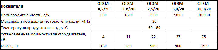 Плунжерный гомогенизатор высокого давления ОГ3М-0,5/20, ОГ3М-1,6/20, ОГ3М-2,5/20, ОГ3М-5,0/20, ОГ3М-10,0/20 Гомогенизатор представляет собой многоплунжерный насос высокого давления с гомогенизирующей головкой. Привод осуществляется от электродвигателя с помощью клиноременной передачи. Процесс гомогенизации осуществляется за счет прохода продукта под высоким давлением и с большой скоростью через гомогенизирующую головку (в щели между притертыми клапаном и седлом соединенных между собой каналом). Давление в гомогенизаторе регулируется вращением винтов, изменяющих размер щели между клапаном и седлом. При этом, на первой ступени устанавливают необходимое для конкретного продукта давление гомогенизации, а на второй - рабочее давление. Характеристики
