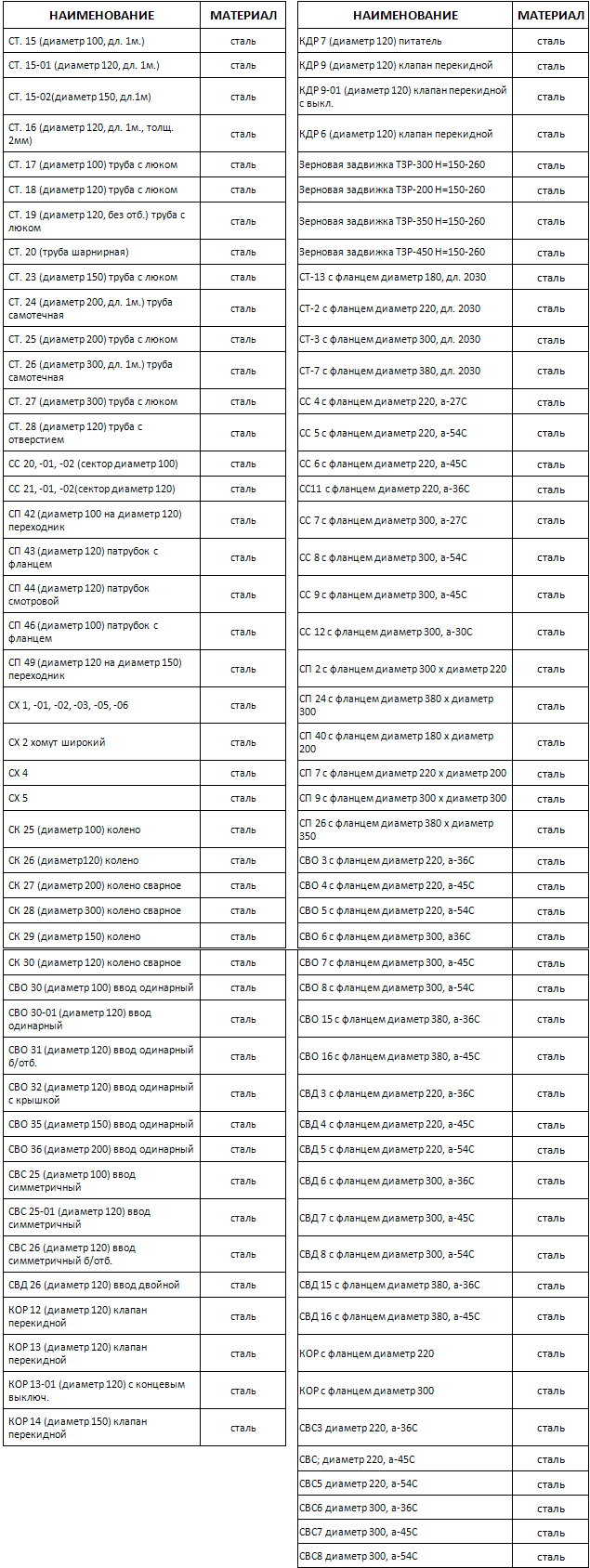 Детали мельничного, элеваторного оборудования, самотеков, детали аспирации, вентиляции, норийные трубы.