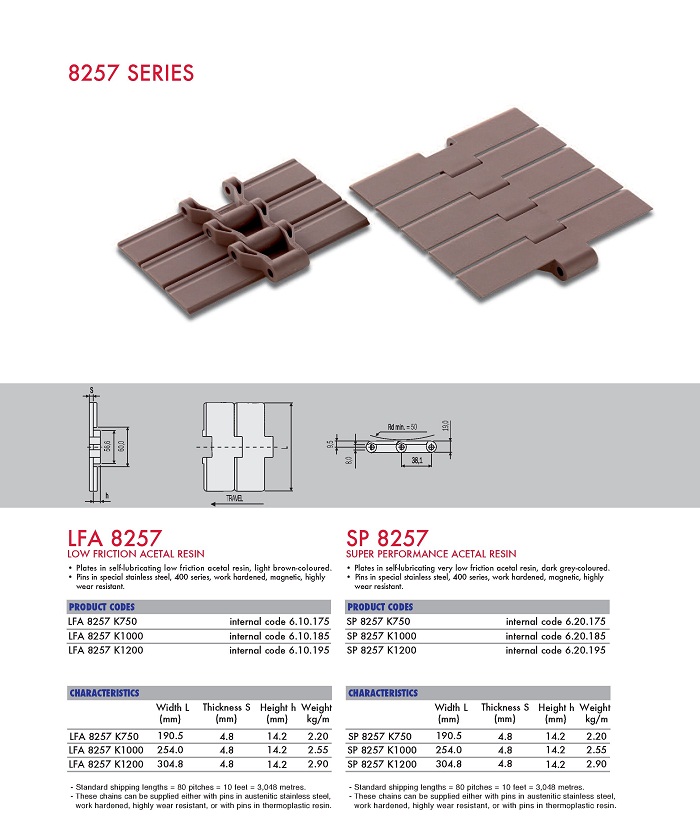 Цепь пластинчатая LFA 8257, пластиковая, предназначена для установки в качестве движущегося, тягового органа на пластинчатых транспортерах (конвейерах)