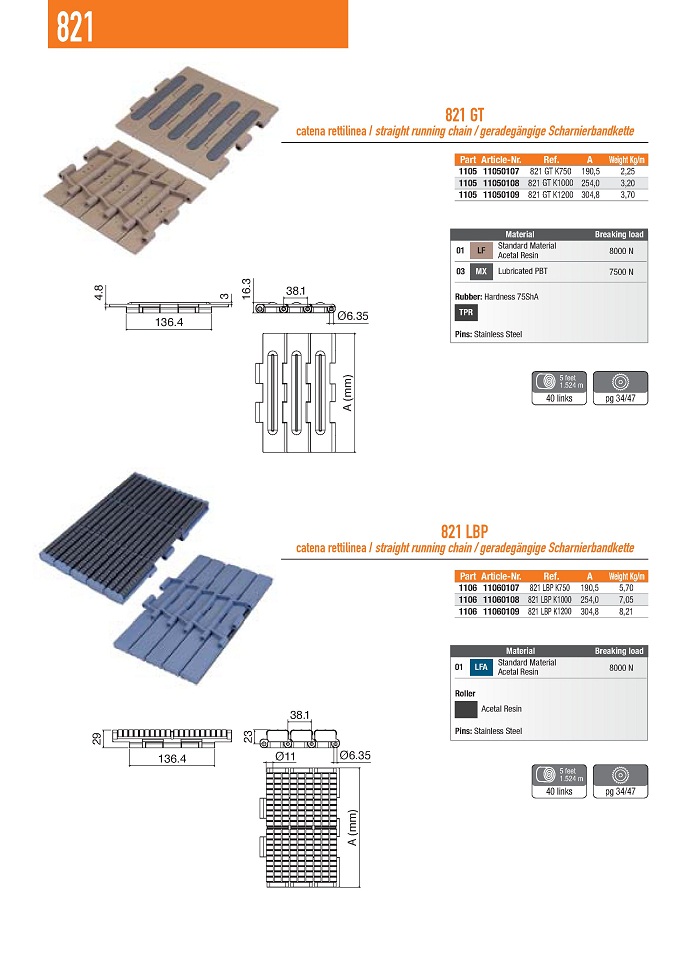 Пластинчатая цепь 821 пластиковая предназначена для установки на конвейерах
