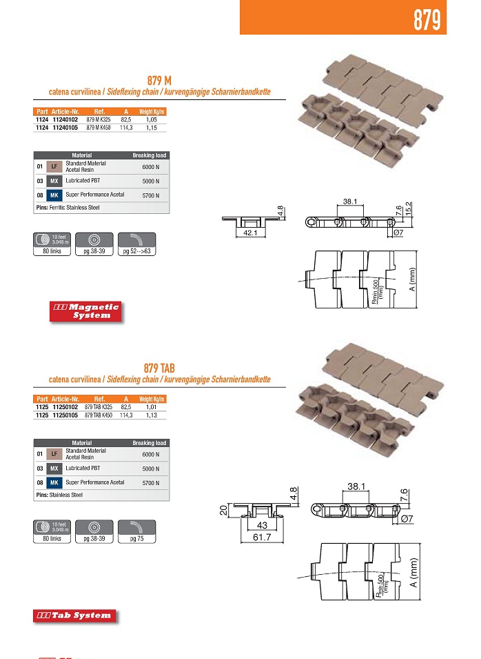 Пластинчатая цепь 879 пластиковая предназначена для установки на конвейерах