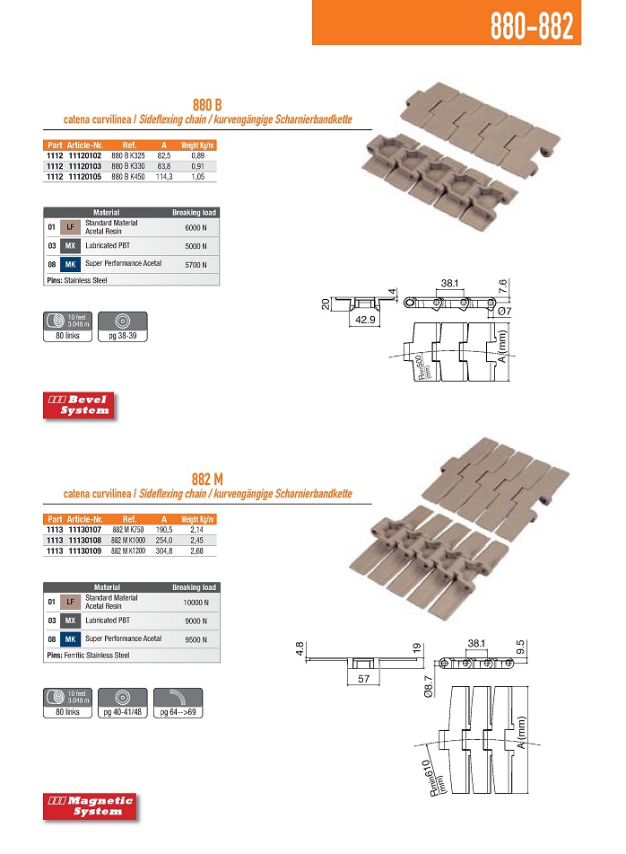 Пластинчатая цепь 880-882 пластиковая предназначена для установки на конвейерах