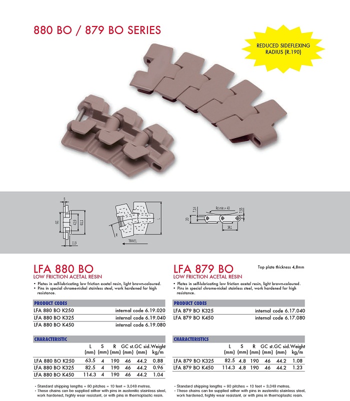 Пластинчатая цепь 880 BO/879 BO Series пластиковая предназначена для установки на конвейерах