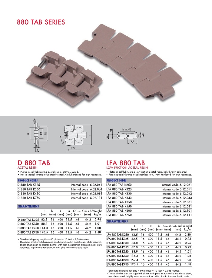 Пластинчатая цепь 880 TAB Series пластиковая предназначена для установки на конвейерах