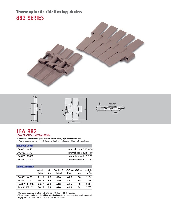 Пластинчатая цепь 882 Series пластиковая предназначена для установки на конвейерах
