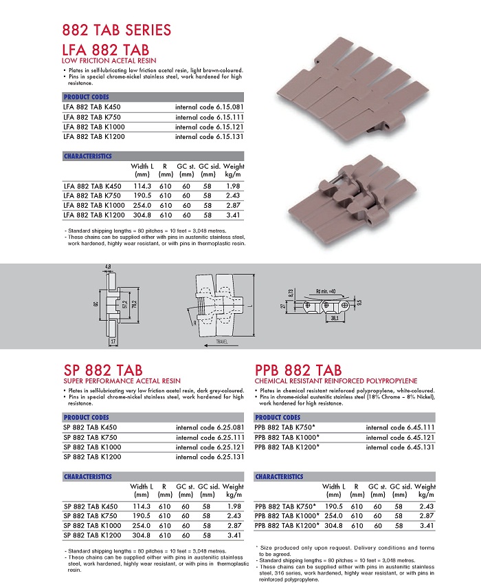 Пластинчатая цепь 882 TAB Series поворотная предназначена для установки на конвейерах