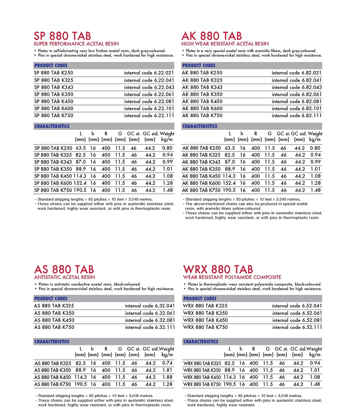 Пластинчатая цепь SP 880 TAB пластиковая предназначена для установки на конвейерах